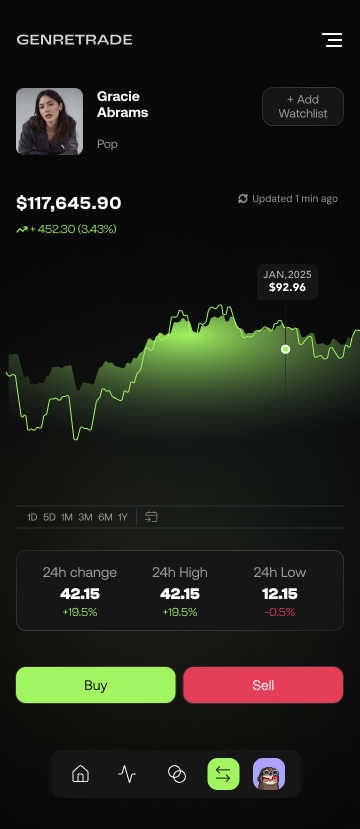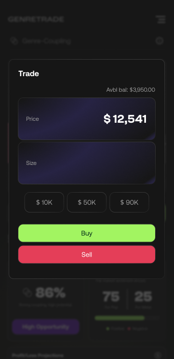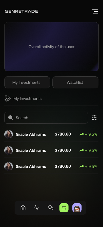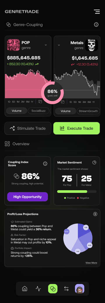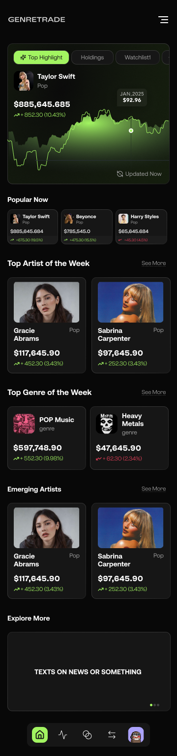 UI/UX Design for GenreTrade: GenreTrade transforms music into a financial trading ecosystem where genres, artists, and trends become investable assets. Our platform bridges cultural passion with financial opportunity, offering fans and investors a new way to engage with music.